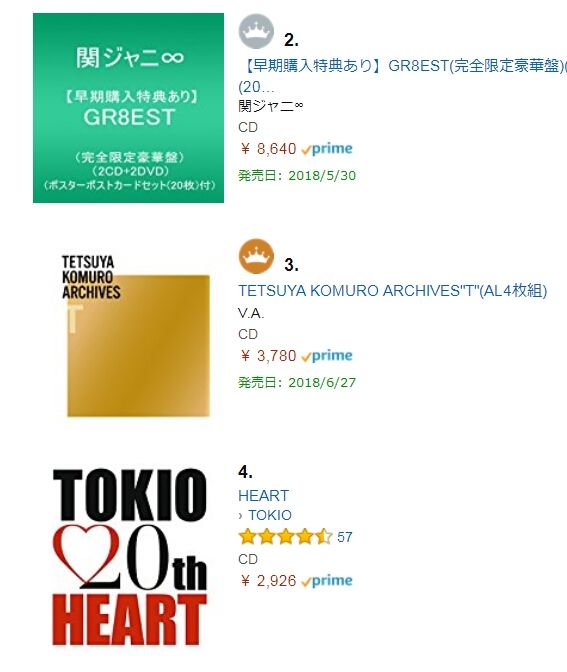 2014年7月に発売されたTOKIOのデビュー20周年記念ベストアルバム「HEART」が、Amazonの売上ランキングで4位にまで急浮上しました。